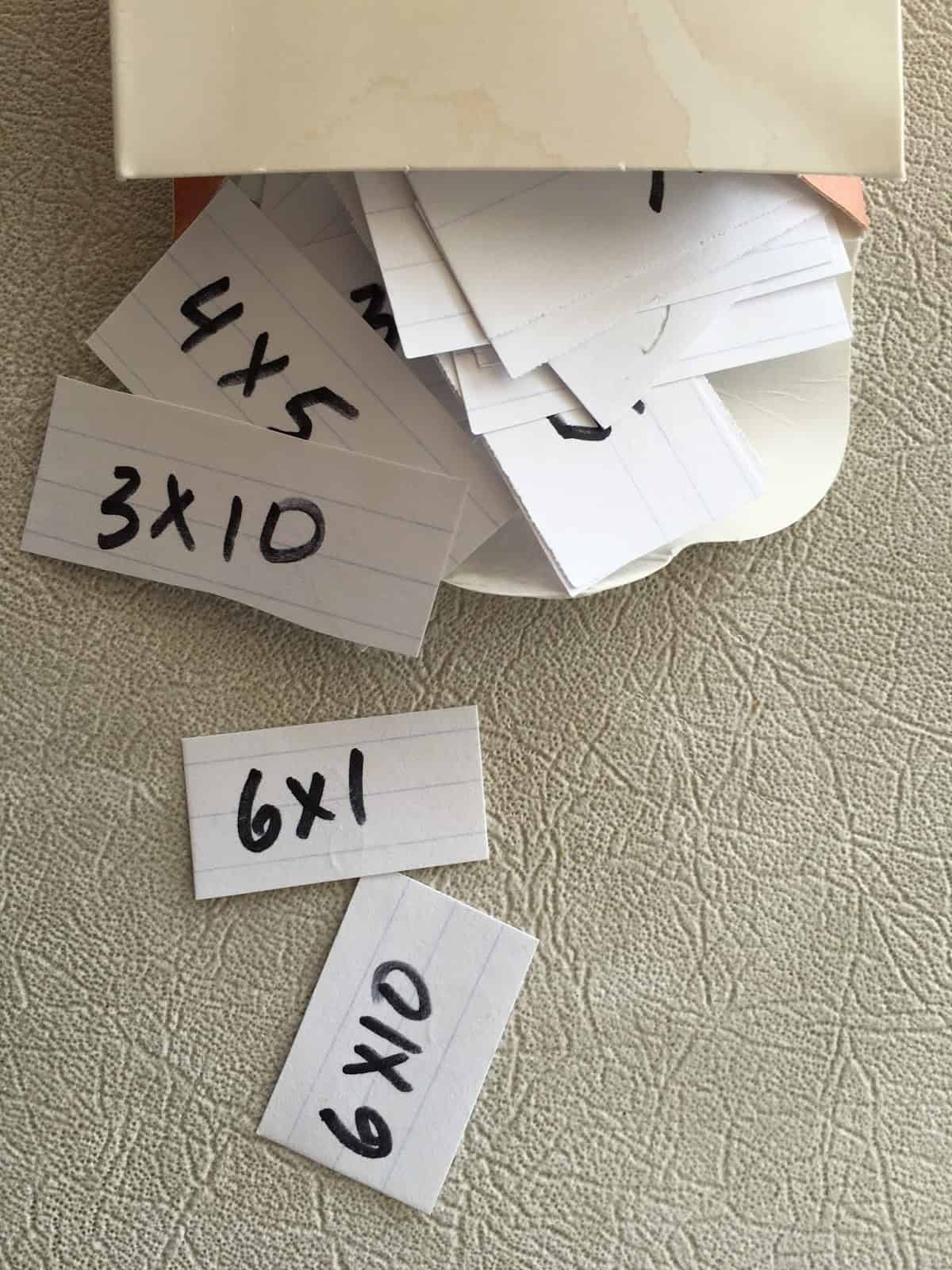 (The addition map is like the one I showed in this post.) We use magnets to pin the maps to metal shelves above the kids’ desks. Each weekend, they chart new progress using a highlighter.The maps are a great way to recognize accomplishment. The kids love adding to the maps and seeing their maps fill up over time. Completing the map brings a strong sense of satisfaction and achievement.For my purposes, the map also suggests hypotheses about where prerequisite concepts might be lacking. I can address those directly in a separate line of work.Here’s what our flashcards look like. They are made out of ordinary 3×5 note cards. (To save paper, I write several problems on each note card and then cut them out with scissors.)