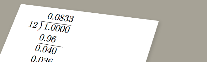 Notice that the remainder after subtracting $8×12$ (hundredths) is the same as the remainder after subtracting $3×12$ (thousandths), namely 4. This means that the 3 in the decimal repeats: we continue to take away 3 groups of 12 (in the ten thousandths place, hundred thousandths place, and so on) and the remainder is always 4. The decimal expansions of all of the fractions are listed below (those which repeat can be found in the same way as $\frac{1}{12}$ above and those which terminate are found when the long division process ends):