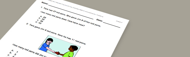 This mini-assessment is designed to illustrate the important content standard 2.OA.A.1 which sets an expectation for using addition and subtraction within 100 to solve one- and two-step word problems involving situations of adding to, taking from, putting together, taking apart, and comparing, with unknowns in all positions. This mini-assessment is designed for teachers to use either in the classroom, for self-learning, or in professional development settings to: