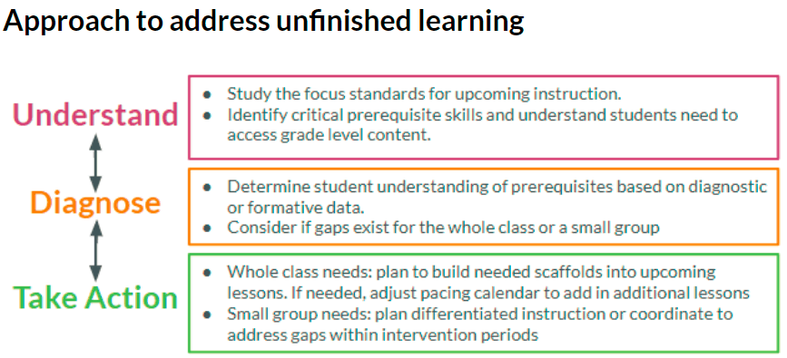 The flowchart above summarizes an approach you can take to identify and address students’ unfinished learning when planning upcoming lessons or units.  You may enter into this approach at different points, depending on when student gaps are identified, and you will likely cycle between the steps as you work with students, as the double arrows suggest.