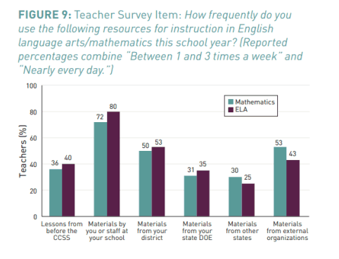 A RAND Corporation survey found that self-developed or self-selected materials (Google, Pinterest, TPT) are the most popular online resources used by teachers, followed by district-provided materials. A report from the Center for Education Policy Research at Harvard University found that many 4th-8th grade teachers are dependent upon materials they develop themselves or those shared by other staff members at their schools. Eighty percent of ELA teachers and 72 percent of math teachers say they use such materials at least once a week.