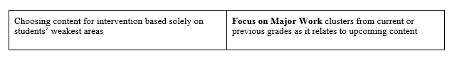With Focus, intervention time should be based on the content that matters most for success in later mathematics. For instance, if a third grade student’s interim data illustrates weaknesses in two clusters: 3.G.A Reason with shapes and their attributes and 3. NF.A.1 Develop understanding of fractions as numbers, prioritize the fraction work since this reflects the Major Work of the Grade. Maintaining attention to Major Work of the Grade will ensure that additional time and attention is spent on foundational content necessary for students to be successful with future math work.