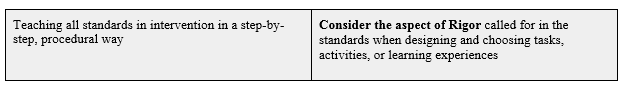 Remember that the standards themselves call for particular aspects of Rigor. Teaching tricks that proceduralize concepts and make ideas “quick and easy” for students undermines learning. Stay true to the aspect of Rigor in the standard and plan as such. For example, if intervening on 6.NS.B.2, Fluently divide multi-digit numbers using the standard algorithm, teach the standard algorithm and practice, practice, practice!