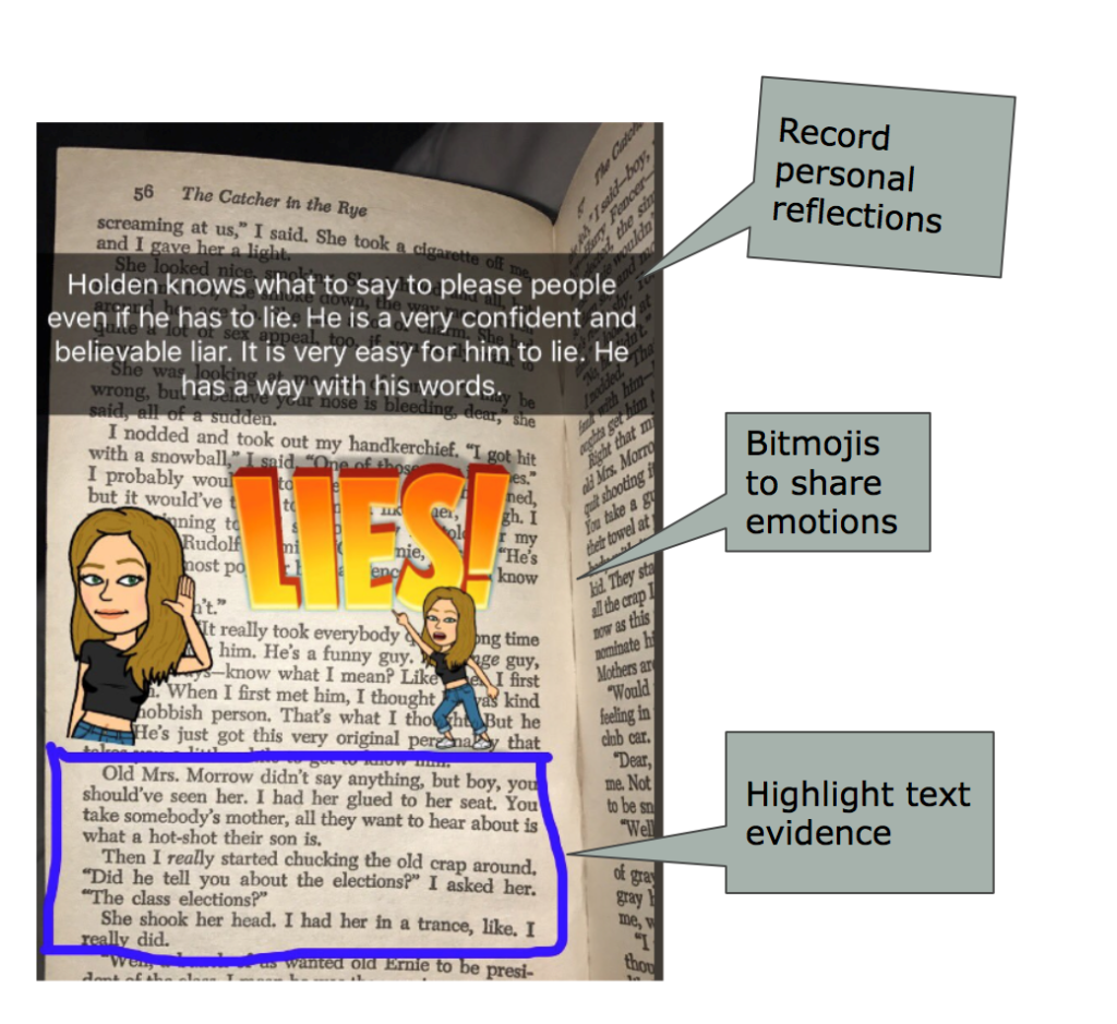 In the classroom I have seen BookSnaps allow students to share connections with the text along with evidence to support a central idea or theme. In addition, it has allowed students to use Bitmojis to display emotions the text generates which often facilitates discussion among the readers when the text draws multiple emotions. Through the use of the BookSnaps, students are able to react to others’ reflections and create dialogue around a common text. Often, after creating BookSnaps, students complete a gallery walk to view other students’ thinking while asking questions based on the evidence provided within the BookSnap. They can also be used within small groups to help foster discussion around a common text.