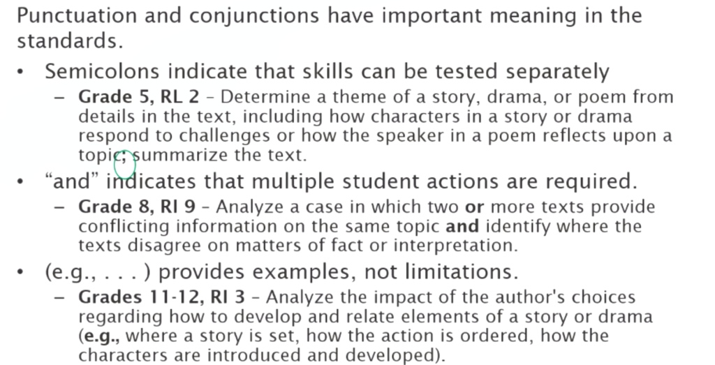Course 1: Appetizers — First, learn how to read the standards. Assessments are based on what type of inference we wish to make about student knowledge. Thus, make sure you are familiar with the following signals within the standards since all assessment questions need to align to the standards.