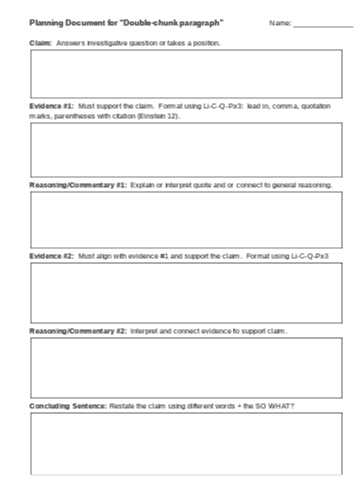 Here is our common student planning template for a double-chunk paragraph, or one claim supported by two pieces of evidence. (It took us science teachers about two months to realize that the word double-chunk was not referring to a cookie!)