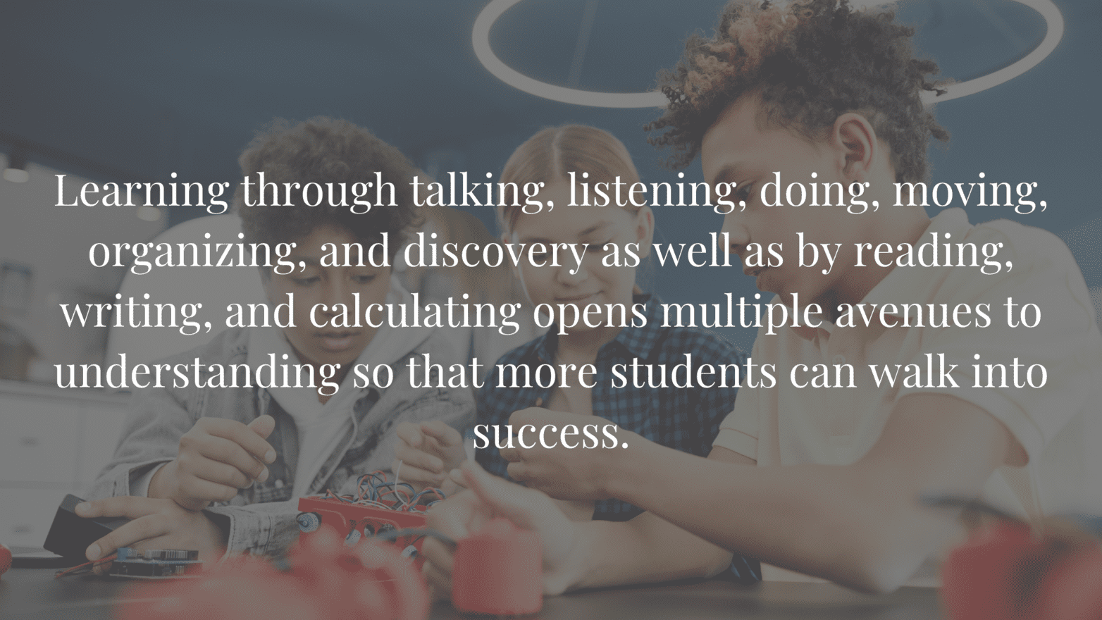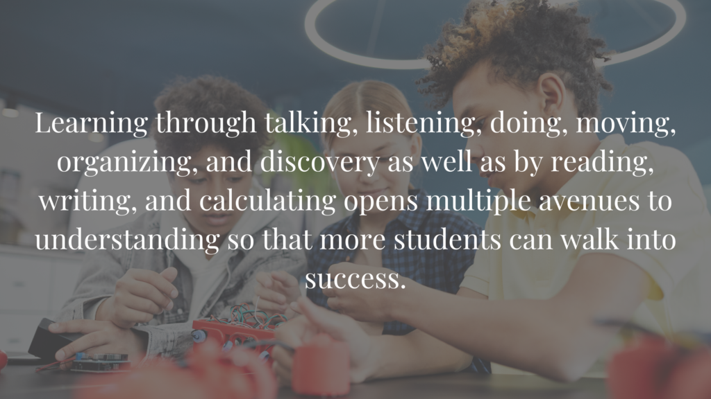 Varied instruction is different from differentiation in the same way that a small restaurant’s seasonal limited-item menu is different from a Chili’s menu: there’s just a few options every day, but there’s something different every day. For example, my 7th-grade Life Science students might build a cell model one day and have a spirited discussion about how to measure osmosis with an egg another day. Sometimes we listen to dorky science rap music, and sometimes we write down what we observe. Learning through talking, listening, doing, moving, organizing, and discovery as well as by reading, writing, and calculating opens multiple avenues to understanding so that more students can walk into success. When we do each of the varied learning activities together, students can witness their peers’ varied strengths.