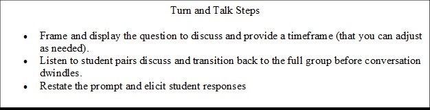 - Creating Multiple Opportunities to Learn: It takes time and multiple passes to develop understanding, so students need regular opportunities to think about, talk through, and refine ideas with a partner. Implementing Turn and Talks is critical to providing students such opportunities regularly.