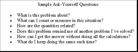- Supporting Internal Sense-Making: It’s critical that students develop their own internal sense-making process to get started and to “jump start” their thinking when they get stuck. In addition to asking direct questions of students, it’s important to develop students’ capacities to ask themselves questions to foster independence and combat learned helplessness. Implementing “Ask Yourself Questions” is a high-leverage instructional strategy to orient students to the thinking without telling them how to think.