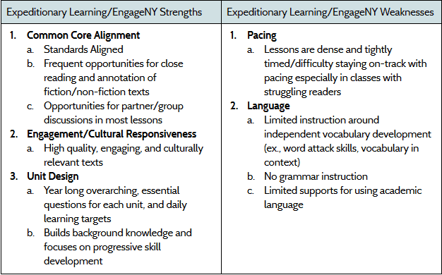 After reviewing the piloting teachers’ findings, the principals voted and unanimously chose Expeditionary Learning curriculum (often called EngageNY because of the company’s previous work with the New York curriculum). They liked the program’s cultural responsiveness, constructivist pedagogy, high rigor, and units that build on previous skills. They did raise concerns, however, about pacing, the level of scaffolding that would be needed to help all students access the materials, and the potential printing costs associated with producing the materials.