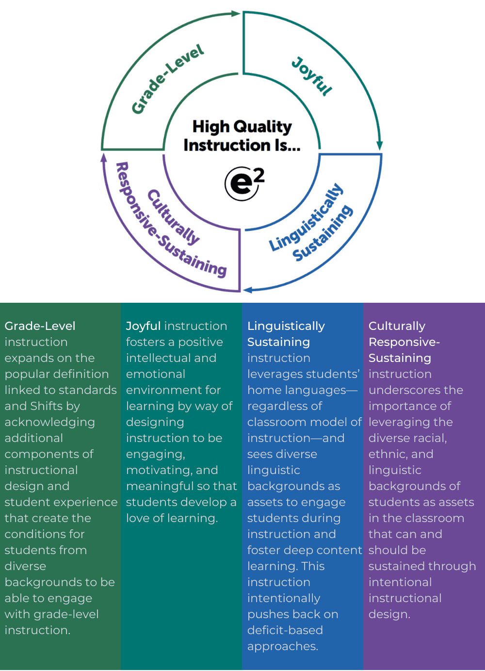 Taken together, these four categories represent a unified picture of best practice in a classroom. e² instruction is a cohesive, systemic approach to teaching and learning that requires the support of multiple stakeholders for it to be realized within any district or school. It focuses on what is possible within classroom instruction while acknowledging that students’ lives and educational outcomes are also shaped by their experiences outside of school. Students are part of broader families and communities, and educators must understand both the opportunities and limitations this reality provides in order to work toward the e² vision of high-quality instruction.
