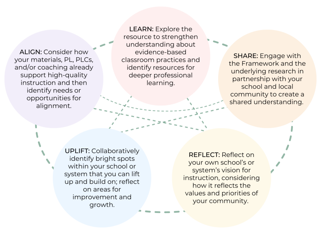 Relatedly, the development of the e² Instructional Practice Framework™ is part of a broader effort to support educators and practitioners at all levels of the system. This effort involves developing and curating resources that provide actionable guidance to identify and understand what’s happening in classrooms across a school or district, deepen their knowledge about what should be happening and how, and respond with coherent, collective action. The e² Instructional Practice Framework™ and related suite of tools will foster a shared understanding of, and progress toward, a vision of high-quality instruction in K-12 classrooms that centers students.