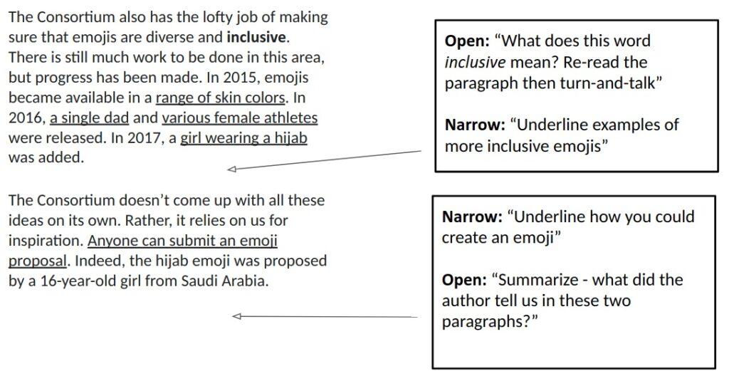 - Narrow queries with text annotations. (Randomly call on students to CFU after). This ensures students are actively processing meaningful “chunks” of the reading.