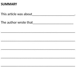 - Students write a summary using sentence starters to encourage writing in third person (e.g. This article was about….the author described…).