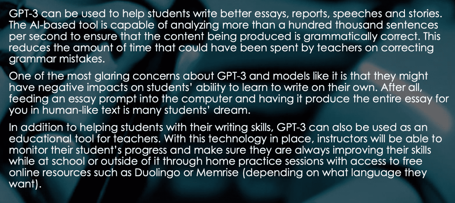 We know that automated writing assistants are changing the nature of essay writing, but are new technologies rendering essay writing obsolete altogether? It’s possible. Natural language processors are creating human-like content light-years ahead of every software to come before. Far more advanced than predictive text, which we’ve all likely encountered in Gmail and Google Docs, Generative Pre-trained Transformer 3 (GPT-3) is an autoregressive language model that uses natural language processing to generate long-form written responses that closely imitate the unique voice and stylistic flourishes of human authors. Increasingly, GPT-3 is becoming scarily good at imitating human writing. It’s especially practiced and talented when following formulaic and predictable structure. Just take a look at the three-paragraph essay below. It was written by GPT-3 about GPT-3. All the user had to do was enter a few keywords and the algorithm took care of the rest.